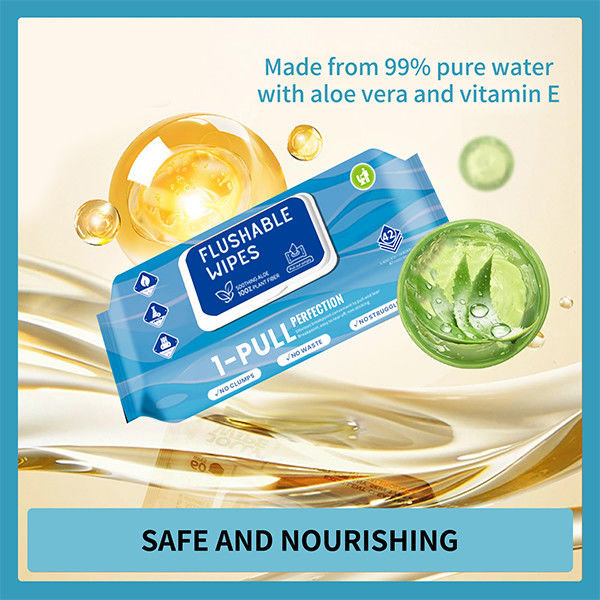 Bulk-Ready Packaging: 42 wipes per resealable bag, 12 bags/box – ideal for wholesale flushable wipes orders.